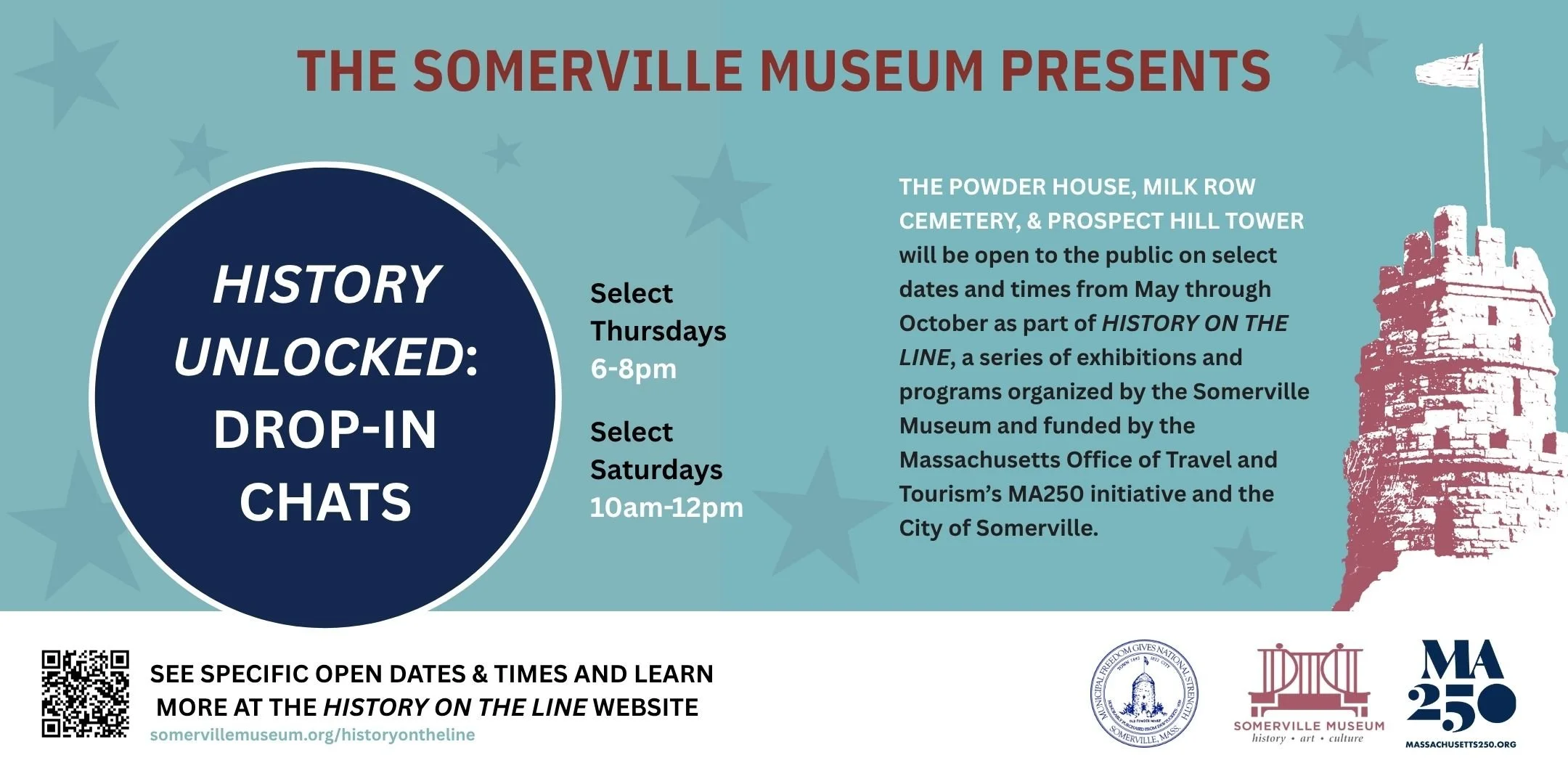 THE POWDER HOUSE, MILK ROW CEMETERY & PROSPECT HILL TOWER will be open to the public on select dates and times from May through October, as part of HISTORY ON THE LINE, a series of exhibitions and programs organized by the Somerville Museum and funded by the Massachusetts Office of Travel and Tourism’s MA250 initiative and the City of Somerville.