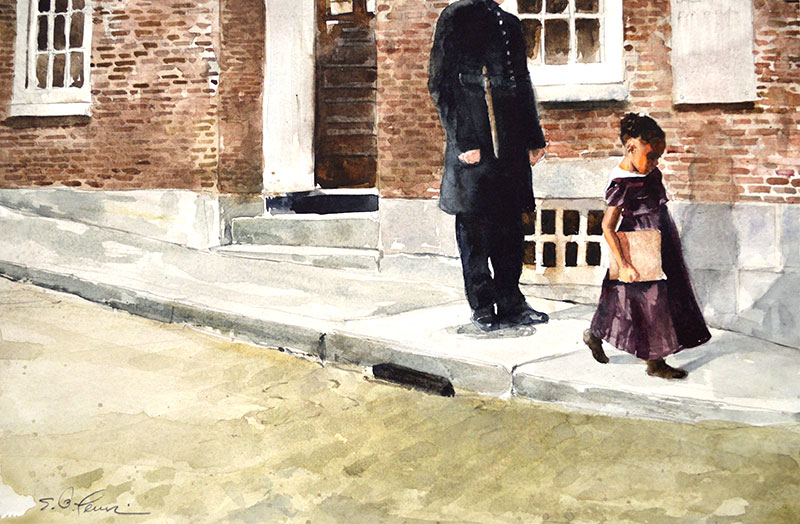 Artwork by E. B. Lewis from the picture book, The First Step: How One Girl Put Segregation on Trial as cited on the Zinn Education website.